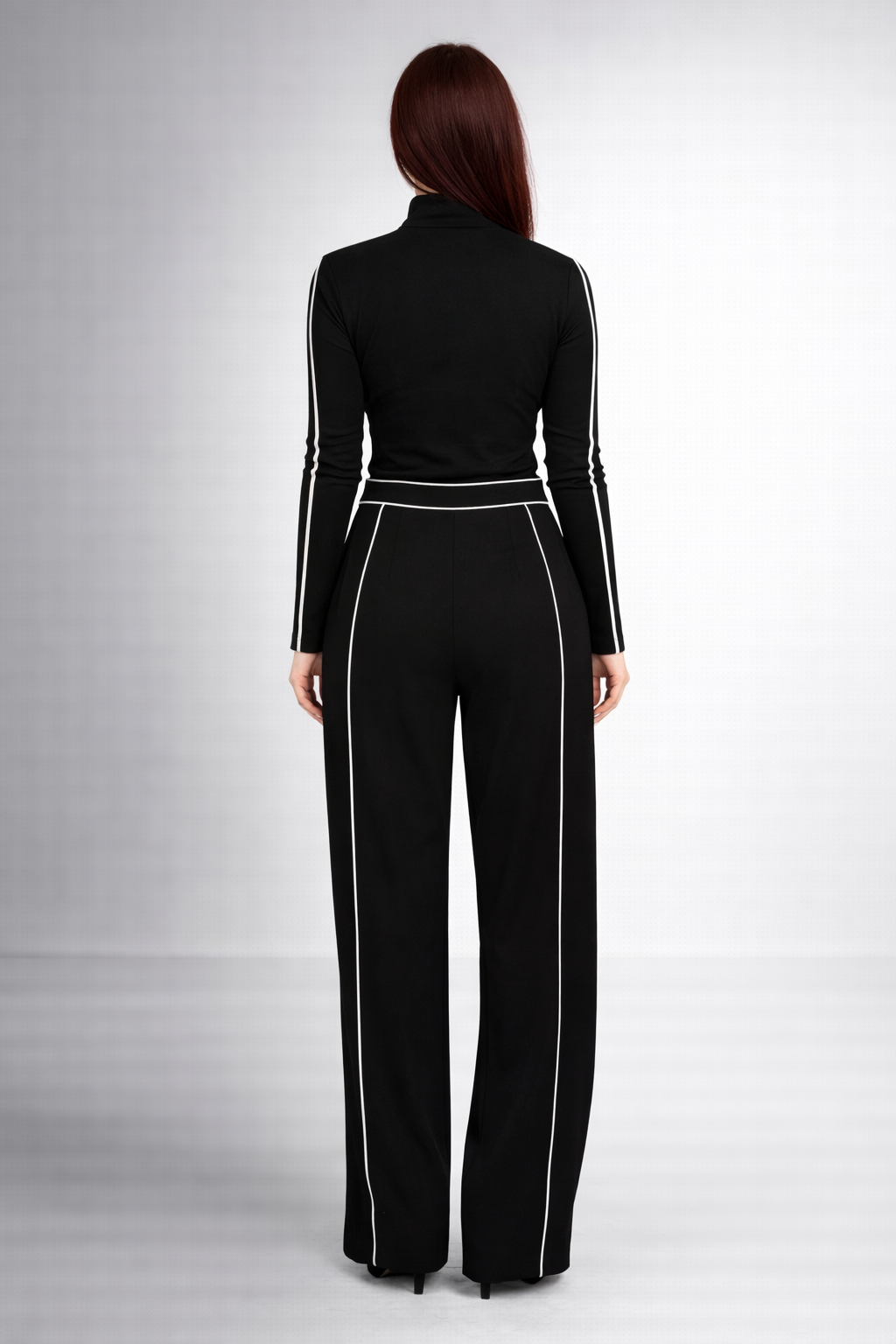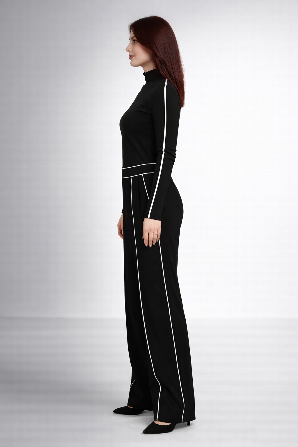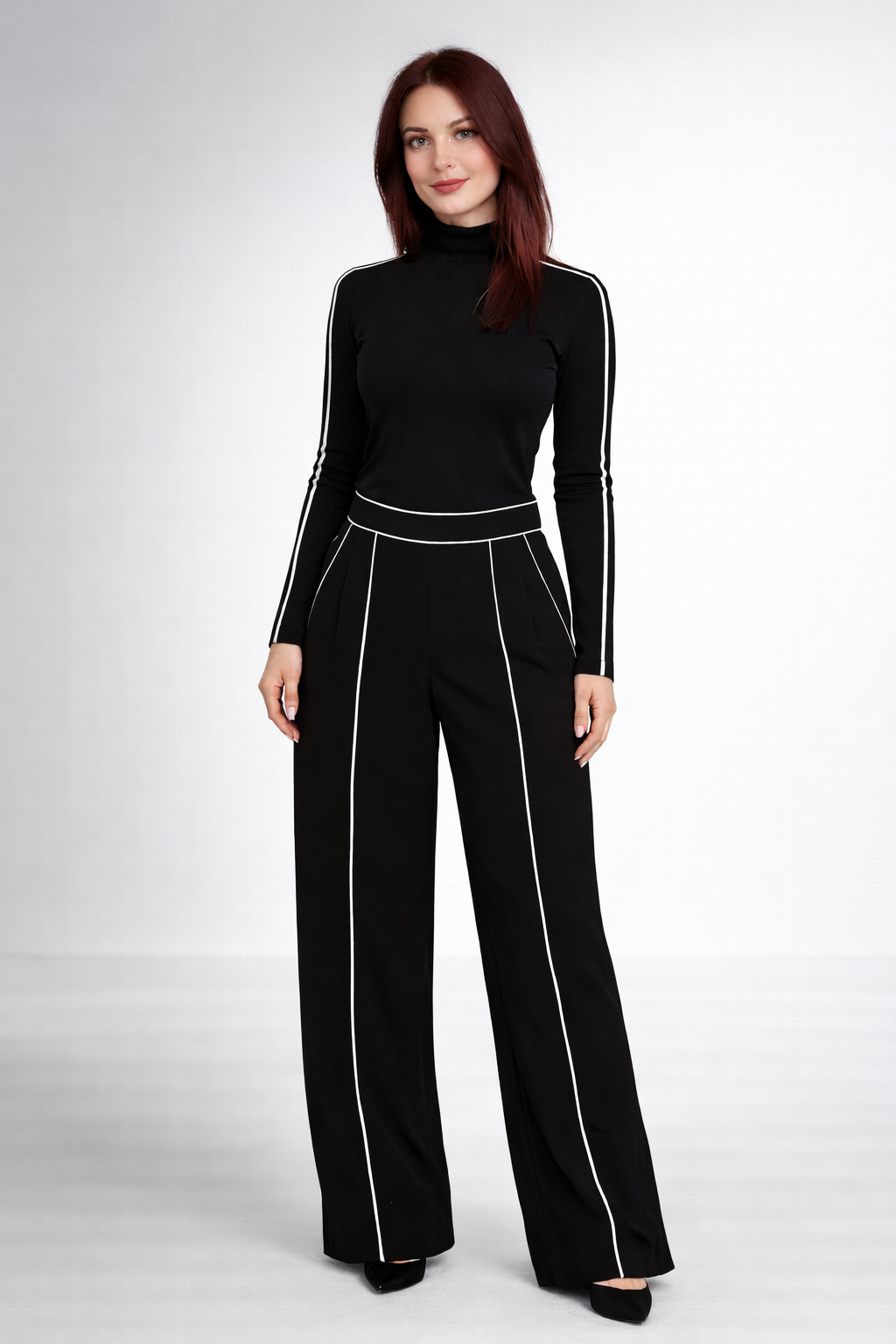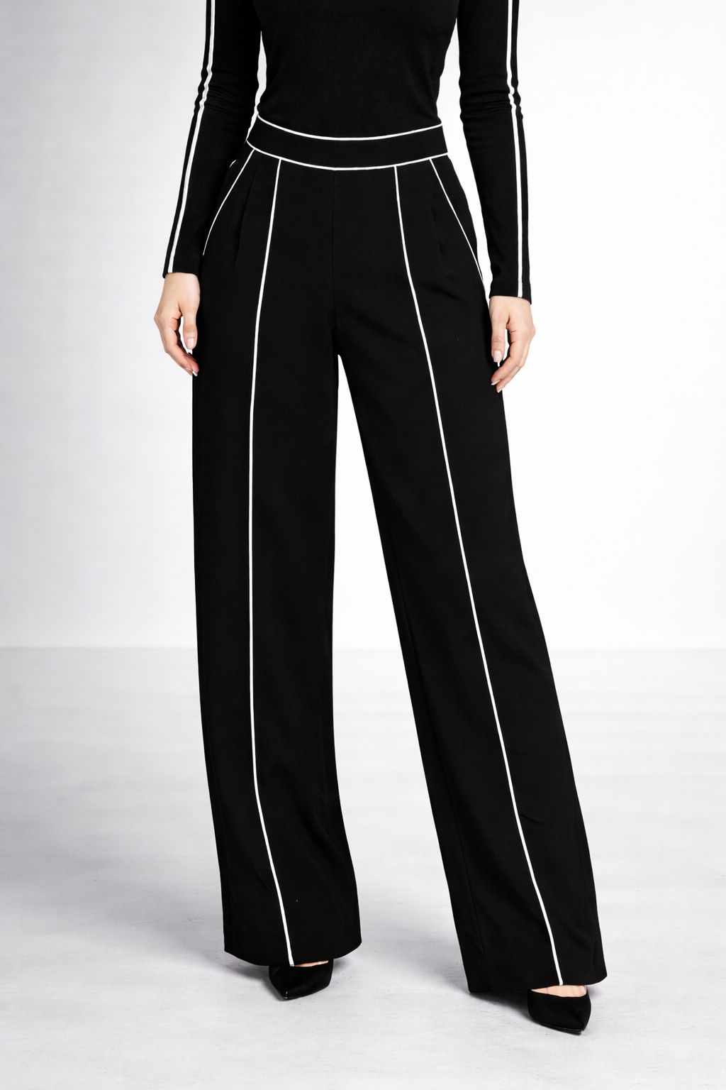 Pantalonii, cu talie bine definită și croială lejeră, sunt evidențiați de benzi contrastante poziționate vertical, care alungesc optic silueta și subțiază linia piciorului. Designul elegant îi face potriviți atât pentru birou, cât și pentru evenimente sau apariții smart-casual.
