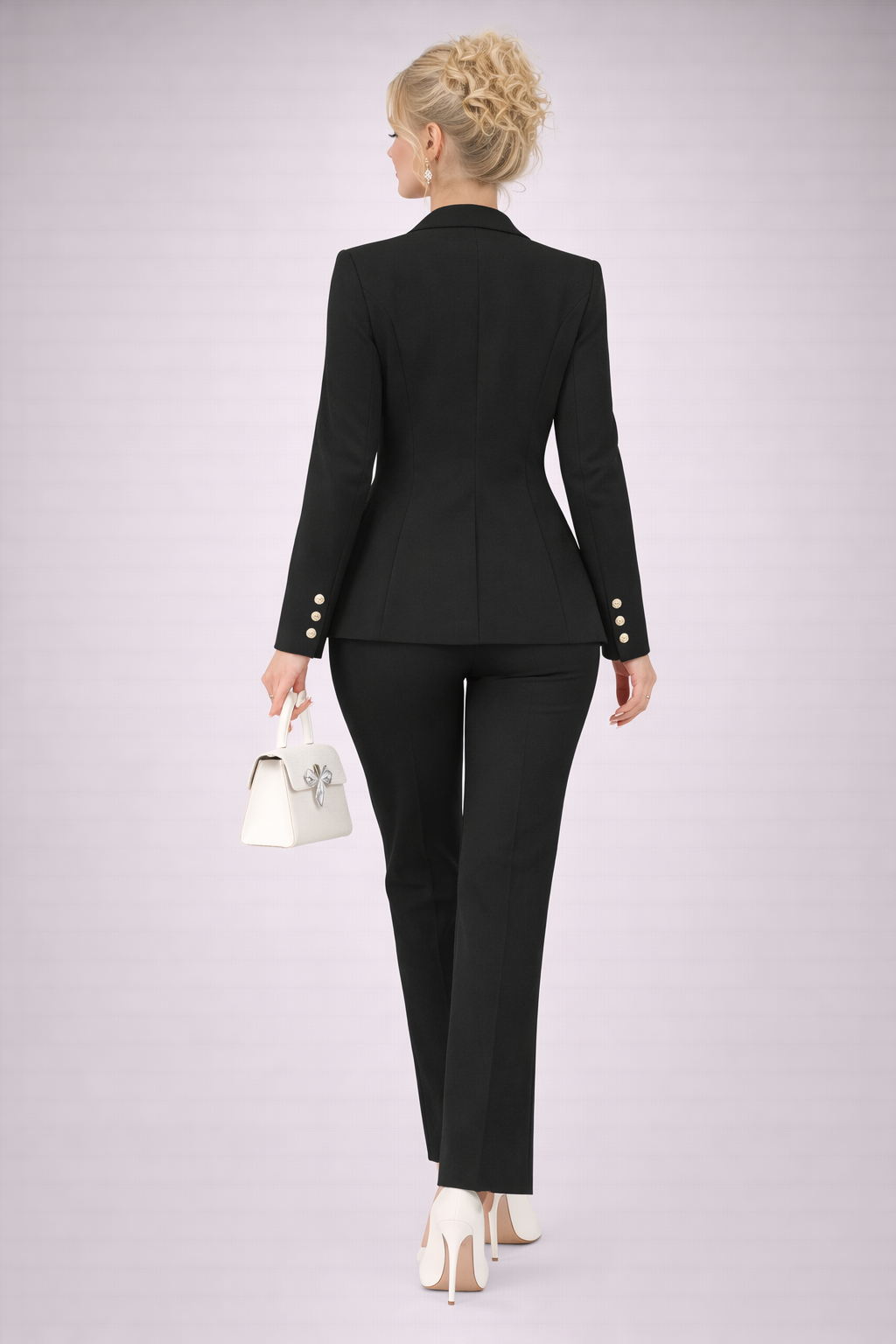 Sacoul negru cambrat evidențiază silueta și impresionează prin cele 12 nasturi cusăți manual, un detaliu exclusiv care reflectă atenția la finisaje și calitatea superioară a produsului. Liniile curate și croiala structurată oferă un aer sofisticat, potrivit atât pentru evenimente speciale, cât și pentru contexte business sau apariții formale.